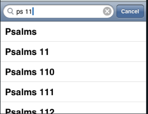 Don’t get confused, this is over in the “reference picker” that you get by tapping the big button on the Scripture screen. The little search bar in the bottom has always allowed you to search for book names, now it can understand chapter numbers as well. If you have focused your search to a single book, type a space followed by a number, and BibleXpress will give you chapter numbers that match what you type. This makes it much easier to go through Psalms!
