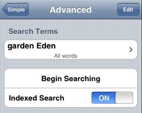 In a slight update, the search terms now show short summaries so you can see their settings without having to tap on them to edit them. Verse summaries also fill in on a background thread, making the user interface more responsive. Using “whole words” actually makes an indexed search run faster, while using proximity, case sensitivity, and exact phrase make it run slower. There are still some loop holes in the indexed search, for instance, proximity doesn’t mix with case sensitivity or exact phrase. You can always switch back to the regular search.