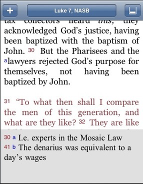 Also, in version 1.1 and later you can read footnotes while reading scripture. Just tap the footnote button in the upper right while reading scripture, the footnotes will slide in.